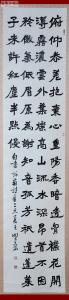 她从颜柳入手,以楷书铺垫书法艺术的基石。颜柳之《勤礼》、《麻姑》、《告身》、《玄秘》、《神策》,钟王之《宣示》、《祭侄》、《黄庭》、《乐毅》,以至欧、楮、董、赵的名碑法帖及《张黑女》、《董美人》、《瘗鹤铭》等历代大小楷书,无不用心临习,有的竟至数过、百遍。三十余年的楷书功底,使她练就了相当敏锐的观察、临摹能力和极其严谨的用笔、造型能力,为她后来进一步的学习打下坚实的基础,也为她后来的创作奠定了基本的“法度”。当然,长期的楷书训练也有其“副作用”,那就是书写拘谨,放不开。为此,她从上世纪八十年代后期开始,放弃一切书画大赛,潜心于魏碑和汉碑的临习。《史平公》、《石门铭》、《杨大眼》、《爨宝子》、《张迁》、《乙瑛》、《史晨》、《礼器》、《孔宙》等碑的反复临习,使她的“颜筋柳骨”更加雄强恣肆、更加拙朴老辣、更加率意灵动,渐渐形成“端庄遒丽、苍劲沉着、秀静典雅、浑厚凝重、气韵超迈”的艺术风格。然而杨兴玲毕竟是位女性,她对自己书法中过度的“丈夫气”和“金石气”并不满意,于是她又转攻行草。从《祭侄稿》、《兰亭序》到《寒食》、《蜀素》、《苕溪》诸帖以至王铎《草书卷》等的临习中,她找到了新的灵气,她的作品增添了“书卷气”,她的书法艺术进入了一个“动静结合”的新的境界。