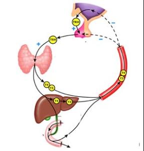甲状腺摄131I率的高低和甲状腺功能状态有关。甲亢患者甲状腺摄131I率增高,甲低患者甲状腺摄131I率减低,但在正常情况下,给予一定剂量的甲状腺激素(包括T3和T4)可以减少甲状腺摄131I率。这是因为在正常情况下,甲状腺摄取碘的功能与垂体分泌促甲状腺激素(TSH)之间有反馈调节的关系,即当血液内甲状腺激素含量增高时,TSH的释出减少,甲状腺的摄碘功能就受到抑制,因此出现甲状腺摄131I率减低。当甲状腺功能亢进时,因甲状腺的分泌具有自主性,可使上述反馈调节关系被破坏,因而无抑制现象,增加促甲状腺素或减少促甲状腺素,很少会影响甲状腺摄131I率,而且甲亢患者垂体分泌促甲状腺素的功能受到明显抑制,因此测量患者服用甲状腺片或三碘甲状腺原氨酸(T3)前后的甲状腺摄131I率加以比较,从甲状腺摄131I率是否下降(即是否被抑制)可以判断是否为甲亢。另外,有人认为甲亢病人的摄131I率服药后不被抑制与患者血中存在的LATS(长效甲状腺刺激物)有关。