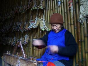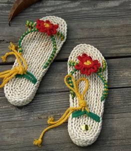 中国结草鞋把草编工艺和中国结工艺巧妙地融为一体。相比而言中国结草鞋还是挺结实的,中国结草鞋的生产流程:先将玉米皮编成辫子,然后用粗尼龙线将辫子缝成鞋底,再缝上棉绳系的中国结帮面,最后,用棉绳将草鞋底和泡沫鞋底缝合在一起即成。