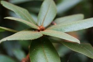 长鳞杜鹃是常绿灌木或小乔木,高1-6米;树皮灰绿色;小枝粗壮,幼枝多少有芽鳞宿存,密被锈黄色顶端有分枝的长毛。冬芽卵状椭圆形,长2.5厘米。叶革质,长圆状倒披针形至狭倒卵形,长5.5-15.5厘米,宽2-4.5厘米,先端急尖,基部窄圆形至浅心形,边缘微反卷,上面暗绿色,除中脉外无毛,下面淡黄绿色,稍粗糙,中脉在上面凹入,下面隆起,侧脉12-14对;叶柄长1-2厘米,被毛同幼枝。