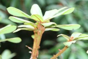 受害嫩枝叶片顶端布满稠密的白色或粉红色的螨质层,有时叶片产生螨瘿,多由蚜虫刺伤叶片感染引起。其防治方法:在清除病叶的同时,喷洒含硫酸铜的药剂;喷洒氧化乐果乳油或将呋喃丹直接放于盆内等方法都可防治蚜虫及其它刺口器的害虫。