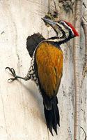 8、大金背啄木鸟属(Chrysocolapteslucidus)仅2种:黑腰啄木鸟(Chrysocolaptesfestivus)和大金背啄木鸟(Chrysocolapteslucidus)。嘴长而直,鼻孔长且扩张。脚格外强壮,大趾发达,爪长而强。外侧尾羽较尾上覆羽略长。分布于印度,斯里兰卡及东南亚各国。我国仅大金背啄木鸟Chrysocolapteslucidus,只见于云南西双版纳及西藏东南部。非常似金背三趾啄木鸟,但体型略大,具两条黑色颊纹至颈侧相连,具四趾而非三趾。雌鸟顶冠黑色具白色点斑。喜较开阔的林地及林缘。成对活动,有时錾木声很大。
