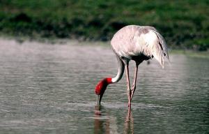 赤颈鹤印支亚种是赤颈鹤的亚种之一,体长为140-152厘米,体重12千克左右。主要的特点是头、喉部和颈上部裸露无羽,皮肤为粗糙颗粒状,颜色为鲜红色,此红色在繁殖期间更显。头顶平滑,呈灰绿色;嘴的基部有一个灰白色的羽斑。眼先有少许黑色的刚毛,颈的基部有时有一个白色的颈环紧邻裸露的上颈部。初级覆羽和初级飞羽为黑色,内侧次级飞羽和三级飞羽延长,覆盖于淡灰色的尾羽上,其余体羽均为灰色。虹膜橙色,嘴灰色或绿角色,跗蹠和趾肉红色或粉红色。[1]