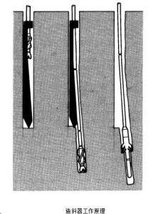 最早用于造斜的工具称为造斜器(见图)。造斜作用是通过造斜器下部的钢质尖楔完成的。造斜钻进开始时钻头锁在造斜器的上部,首先将造斜器下到所需造斜深度(井底)时进行定向,使楔形面所对的方向为造斜方向(楔形面所对的方向又称为工具面)。造斜器定向以后施加一定的钻压,以使造斜器固定于井底,在钻头开始旋转时它不转动。在施以附加的钻压剪断连接钻铤与造斜器的销钉,转动钻头。造斜器强迫钻头在向下钻进的过程中沿着造斜器的楔形面向所需要的造斜方向逐渐偏斜。钻进至造斜器上部到达停止位置后起出造斜器,下入领眼和扩眼钻头钻进,将造斜井段井眼扩大到原来井眼尺寸,起钻下入常规钻进的下部钻具组合继续钻进。