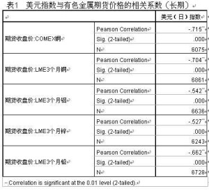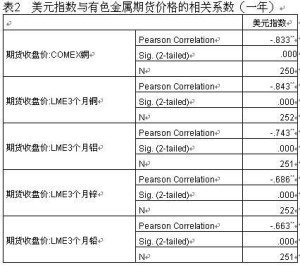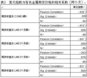 综合上述相关分析结果可以看到,中长期美元指数与有色金属铜、铝、锌、铅期货价格显著负相关;短期美元指数与锌期货相关不显著;美元指数与铜期货价格相关程度最高;样本容量越小,相关程度未必越高。对于铜期货操作而言,美元指数是重要的参考指标。对于其它有色金属,美元指数参考意义有限。
