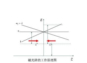 磁光阱是一种囚禁中性原子的有效手段。它由三对两两相互垂直、具有特定偏振组态井且负失谐的对射激光束形成的三维空间驻波场和反亥姆赫兹线圈产生的梯度磁场构成。磁场的零点与光场的中心重合,负失谐的激光对原子产生阻尼力,梯度磁场与激光的偏振相结合产生了对原子的束缚力,这样就在空间对中性原子构成了一个带阻尼作用的简谐势阱。
