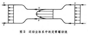 蠕动流的原理可用附图说明,设有一两端封闭的静止长管,管的两端面上压力相等。一套在圆管上的滑块将管压缩,滑块以速度向右移动,引起收缩部分流体运动。在固定坐标系中流动是非定常的(图1)。