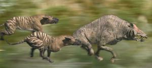 完齿猪(3)事实上,对它们来说,用嘴巴完全咬住另一只同类的头,似乎是相当稀松平常的事!它们的脸部布满骨疣,就跟现在的疣猪一样,而且分布得恰到好处,以便在这样的战斗中,保护细致部位。这些骨疣似乎非常管用,因为即使是伤痕累累的完齿兽,其受到保护的眼鼻部位仍不见损伤。它们巨大的头颅非常强而有力,可用来撞碎骨头。发现完齿兽的化石岩层,找到许多带有残骨痕迹的牙齿。它们很明显是吃腐肉的动物,而且很可能是碰到什么就吃。