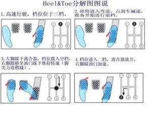 所谓跟趾动作,就是在过弯前,在刹车的同时,利用右脚补油的技巧,将挡位降到合适出弯时的挡位上。这里的“跟”就是指脚跟,“趾”即是指脚趾。