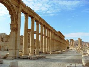 据有美术史家分析, 帕尔米拉建筑文明比 罗马文明出现得更早,在受到古 希腊和古罗马影响之前,帕尔米拉的建筑和装饰就已经被其入侵者模仿和实践了!帕尔米拉大街遗址也震撼人心。一条青石大道,全长1600米;两边每隔10米一根的浮雕 石柱,横托起沉重的青石水槽(此设施据说既有通水的功能,又有降温的效用。这在燥热的沙漠城市,确实是一大发明),相连成两条巨龙般的柱廊,真是奇伟壮丽,气势如虹。
