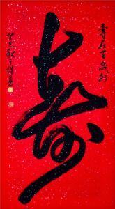 《养生经》中写到上寿百二十,中寿百年,下寿八十。于老师创作的寿字为上上之寿,于老师的书法采千古之遗韵,熔百家于一炉,龙蛇飞舞,俏俊飘逸,大气磅礴,豪放酣畅。历朝历代都有皇亲国戚、朝臣名士书写“福寿”二字。不同朝代、不同字迹、不同形式的“福寿”书法,构成了中国历代书法史上的一大奇观。而在众多的福寿书法中,于老师首创的合文榜书“福寿”二字笔触圆润、饱满,运笔流畅而稳健,如行云流水,一气呵成,通畅自然。既对福寿二字进行了变形变体的创造,又进行了巧妙的排列组合,通过复杂变化的组合形式,来表达对长者长寿、平安的祈望,内含“人生万福中”与“寿在百岁外”两句吉祥语,尤为独特,耐人寻味,堪称是一幅精美的艺术品。于谋勇老师首创合文一体榜书 “福寿双全”为当代书法第一“福寿”,给天下人送上温馨的祝福:人长寿、国永固、物永存的美好祝福和象征。