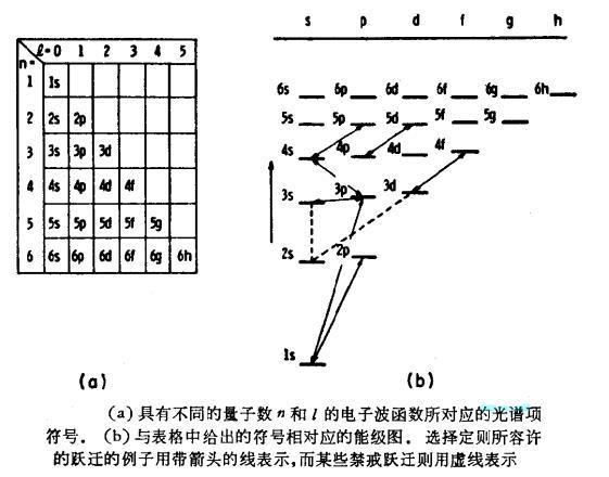 分别代表l==0,1,2,3…(最初它们表示碱金属光谱的锐线系,主线系,漫线系和基线系)。因此,最低的一些光谱项符号如下面左图所示。例如,3d电子是在n=3和l=2的轨道上的。