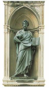 这件作品与公元1413年多纳太罗的同名作品《圣马可》非常相似。不同之处在于吉贝尔蒂的圣马可手中的书是摊开的,右手抬起,仿佛在告知人们什么;而多纳太罗的圣马可把左手中的书揽在胸前,右手放松下垂,姿态更为自然随和,相比起来,更具有学者风范,吉贝尔蒂的圣马可则显得更加严肃和沧桑。吉贝尔蒂在作品中同样运用古希腊雕像的"重心转移"法则,马可一腿微屈,一腿则直立,使之看上去更显舒适,由此看来,哥特式那种僵硬和冷漠的时代终于成为过去。