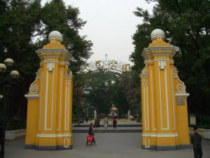 广州人民公园“音乐亭” 2011-10-20公园采取意大利图案式庭园布局,呈方形对称形式。园内古树参天,绿篱花丛,富有浓郁的地方特色。有清初雕制的汉白玉石狮及1926年修建的音乐亭。后陆续增设了盆景园、儿童游乐场、敬老亭、露天音乐茶座,展览大楼等设施,1987年又建成《烽火年代》、《鲁迅》、《冼星海》、《猛士》、《新娘》、《椰林少女》等 6座雕塑。塑像根据题材需要分别采用青铜、黄岗石、汉白玉、红粉石等材料制成,使作品更加有富有生命力和艺术感染力,构成公园的一种特有景致。从1978年开始,公园每年都举办菊展、迎春花会和中秋灯会。