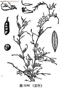 多年生草本,高70-90厘米。茎具棱,被疏柔毛。偶数羽状复叶长7-11厘米,叶轴末端有卷须;托叶戟形或近披针形,长0.5-0.7厘米,宽0.1-0.5厘米;小叶9-11对,狭披针形,长1.5-2.7厘米,宽0.3-0.6厘米,先端渐尖,具短尖头,基部斜圆形,两面及小叶柄被毛。总状花序短于叶,花2-7朵着生于花序轴上部;花萼近钟状,长约0.6厘米,外面被绒毛,萼齿锥形,长约0.2厘米;花冠紫色,旗瓣长圆形,长1-1.2厘米,宽约0.5厘米,先端钝圆微凹,瓣柄相当于旗瓣片1/3,翼瓣与旗瓣近等长,龙骨瓣短于翼瓣;子房纺锤形,长约0.5厘米,胚珠6,花柱团形,与子房联接近呈90°夹角。子房柄长约0.3厘米。荚果未见。花期7月。