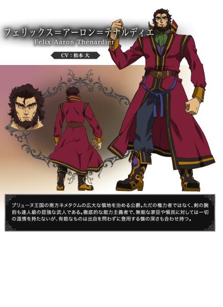 菲利克斯·安隆·泰纳尔迪耶(フェリックス=アーロン=テナルディエ,Felix Aaron Thenardier)声优:松本大布鲁奈王国的上流贵族,两大公爵之一,42岁。拥有和艾伦不相上下的剑技实力。泰纳帝迪耶公爵势力庞大,并且拥有广阔的领土和数量极多的可动员兵力,是泰格勒这种边境贵族所望尘莫及的一种存在。他锐利的眼神中蕴含着对自己力量的自信和毫无所惧的高傲,不论在王国主办的马上对战中还是和与邻国萨克斯坦的战争中都立下过显赫战功,几遍已经是42岁的高龄但却依旧持续锻炼著自己的身体。曾娶国王的侄女为妻,成为王家姻戚。可是其自信却逐渐转变为高傲自大而导致他出现残虐的性格,开始理所当然地蹂躏领民。是个能够面不改色十分坦然地下达冷酷无情命令的人,另外亦保留理性判断能力,至少不会对有利用价值的人施以严厉惩罚。同时还具备着强烈的野心,时刻窥视着敌对者的动静。在法隆王病倒后泰纳帝迪耶开始不断扩张自己势力,更为了显示自己的力量而下令自己的儿子锡安将整个阿尔萨斯烧毁,一方面还为了权力斗争而与两大公爵另一角的冈隆公爵开始明争暗斗,导致布鲁奈王国陷入内乱。最终与泰格勒进行一对一决战,被泰格勒射杀。(已死) |