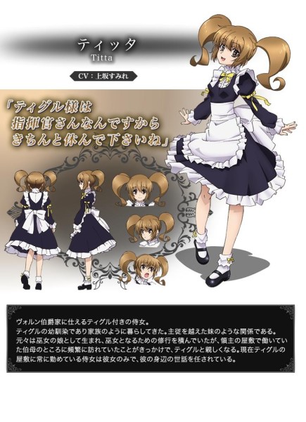 蒂塔(テイッタ,Titta)声优:上坂堇泰格勒的侍女。15岁(第一卷),比泰格勒小一岁。。特征是以缎带绑成双马尾的栗色头发、一张娃娃脸、娇小的身躯和与同龄女孩无异的身材。个性很有活力,对于泰格勒而言是有如妹妹般存在的青梅竹马。内心坚强,即使在泰纳尔迪耶军袭来的时候也不愿离开领主宅邸。在第一部故事中随军服侍着泰格勒的生活,并作为一名祀神巫女在意想不到的地方帮助到了泰格勒。巫女的女儿,自身也是为了要成为巫女而进行修行,但对在神殿学习阅读写字或是咏唱献给神明的赞歌没大兴趣。相对地很喜欢去在领主宅邸中工作的伯母那里,以此为契机和泰格勒关系变得很亲密。在11岁的时候因向母亲表达想要成为女仆的愿望而被母亲反对,结果由泰格勒帮她说话而实现了她的梦想。最后她答应修习巫女的所有必备学问、礼仪和祈祷咒术,还有为保持巫女的圣洁而必须每十天去神殿祈祷这两个条件,在这个前提下成为了侍女。现在长期在泰格勒的宅邸中工作的女仆只有她一个人,一手负责著照顾泰格勒的工作,而且一直无微不至的照顾着他。虽然喜欢泰格勒,但因为身份的不同而自觉地将自己的感情停留在作为一名女仆来尽全力侍奉的程度。直到得知泰格勒被掳后才为赎回泰格勒而努力,并在坚信泰格勒一定会回来以下拒绝避难。在艾莲出现以后也开始变得不安起来。之后即使泰格勒决定投身于更大的战斗之中而建议她先去马斯哈那里避难,也下定决心要一直跟随在他的身边。在泰格勒受伤后,亦是由她照料着他。亦很受士兵们欢迎。在奥尔梅亚会战后亦全权负责照顾蕾琪的工作,并在谈论泰格勒的过程中成为了朋友。布琉努王国内乱以后,跟随着泰格勒到莱德梅里兹公宫工作。当泰格勒准备担任密使前往亚斯瓦尔王国以前亦向她告知,并希望她协助掩饰行踪。但在苏菲转交泰格勒的土产时得知泰格勒落海失踪以后,悲痛得要莉姆安慰并让她暂时退下了。第十五卷和男主发生了点什么。并能与女神交流,小说最后作为侍奉蕾琪的侍女,在王宫生活小说结局作为蕾琪的贴身侍女生活在布鲁奈皇宫,是一位因为皇宫有事能特地跑出去将不知道跑到哪里的蕾琪带回皇宫的强力女仆 |