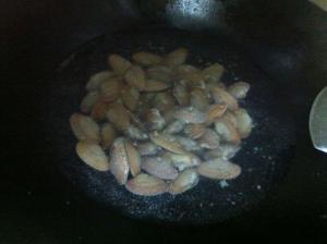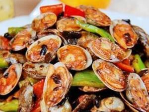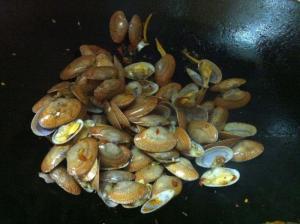 3. 锅入油加热,爆香姜葱,入花甲螺翻炒数下,放糖、辣椒酱,翻炒N下,入生抽上色均匀后装盘即可。