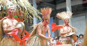 “出地方”祈保平安稻草和玉米堆成的草垛前,近十名汉子赤裸上身,头戴稻草编织的帽子,身穿稻草编织的草裙,脸上画着红绿两色的油彩,手执刀戟、表情肃穆,随着音乐节奏一边舞动,一边发出庄严的呼喊声……26日上午11时左右,黟县碧山村祠堂里,正上演着“丰年祭”仪式“出地方”。许久没有看到这种纯正的祭祀舞蹈,围观的村民不时发出阵阵喝彩。