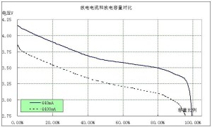 从右图上可以看出,电池放电电流越大,放电容量越小,电压下降更快。