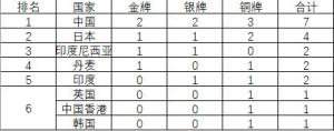 中国队以2金,2银,3铜的成绩名列奖牌榜首位。