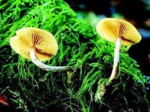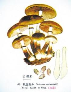 子实体小。菌盖直径1.3-4.5cm,半球形、钟形至扁平部凸起,初期污黄色,后呈黄褐色,中部色深,边缘具不明显的细条棱,湿润时粘。菌肉淡褐色。菌褶较密,直生,初期黄色,后变黄褐,长短不一。菌柄上部黄色,下部黑褐色,长5.4-8.3cm,粗0.3-0.7cm,空心。菌环膜质生菌柄上部。孢子印锈色。孢子淡褐色,近椭圆形,具盔状外膜和疣状小突起,8.5-10μm×4-5μm。褶侧囊体淡黄色,瓶状,60-72μm×10-12μm。褶缘囊体与褶侧囊体相似。