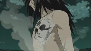 第四次忍界大战时被带土复活后,上半身的衣服以及盔甲则被佐助的天照烧光,处于半裸形象。在吸收柱间的仙术查克拉后,左胸口处的“柱间脸”则出现了仙人模式后的脸谱,此时斑已经进入仙人模式。