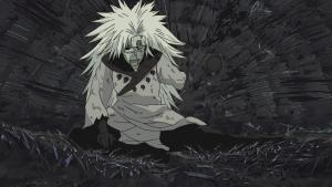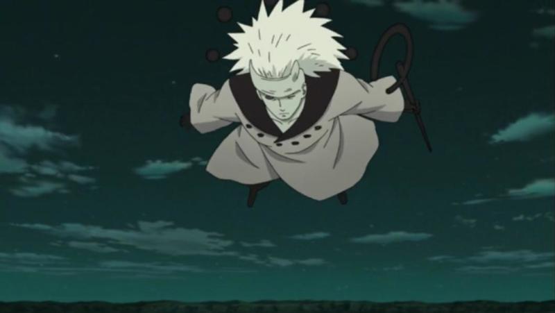 十尾人柱力 斑双手结印后通灵出十尾,施展“六道十尾柩印”将其吸收在自己的体内,紧接着,斑的长发变为了白色,身穿六道仙人的白色风衣,八颗求道玉在斑的背后绕成一圈漂浮着,双臂与双腿也变为黑色,左手手持六道禅杖,斑成为了十尾人柱力,可以在空中自由飞行,能够彻底摧毁秽土转生之躯。宇智波斑吸收神树的本体,开启了轮回写轮眼,能够施展无限月读。 |