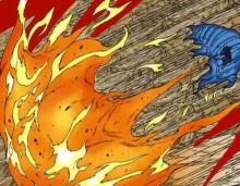 火遁·豪火灭失 豪火灭失从口中吐出巨大的火球,落地后可以扩散到很大一片范围。范围比豪火灭却更大,可以瞬间点燃一座森林。 |