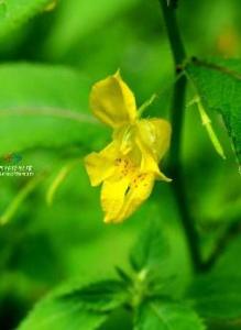 总花梗短,长5-15毫米,具2-5花,稀单花,花梗细,中部具刚毛状或刚毛状披针形的苞片,被短柔毛。花金黄色,长达2.5厘米;侧生萼片2,圆形,被微柔毛;旗瓣圆形,中肋背面具鸡冠状突起;翼瓣无柄,基部裂片圆形,上部裂片长圆状斧形,背面有反折的小耳;唇瓣囊状,多少被微毛或脱落,基部急狭成内弯的短距。花药钝。子房纺锤状,被密柔毛。