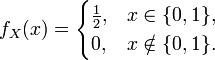假设X是抛硬币的结果,反面取值为0,正面取值为1。则在状态空间{0, 1}(这是一个Bernoulli随机变量)中,X = x的概率是0.5,所以概率质量函数是:
