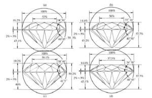 标准圆钻型切工是波兰数学家马歇尔于1919年首先计算出理论上让钻石反射最大量光线的切割方程式。圆明亮型切工是由57或58个刻面按一定规律组成的圆形切工也称理想式切工,顶部的平面被称为台面,直径最大的部位为腰围,腰围以上为冠部,腰围以下为亭部。托考夫斯基切割也叫美国琢型,其他有德国琢型、欧洲琢型等。