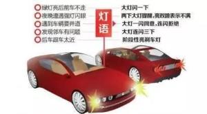 交叉路口,一车闪灯,表示“我想过”。另一车如无表示,则是同意,如连续闪灯,则是说,“我有急事,让我先过!”闪烁远光提醒对方会车关闭远光灯,避免看不清路面。
