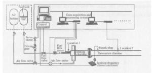 两相脉冲爆震发动机原理性试验模型装置示意图如图所示,由供油、供气系统,爆震点火及频率控制系统,混合室,爆震室,压力测量系统以及数据采集系统等组成。模型试验器由内径 50mm 的钢管加工而成。爆震室 (包括混合室 )的头部封闭,尾端敞口。其中爆震室长1.30m,混合室长 0.20m。在混合室出口处安装火花塞,由频率在 1 ~ 100Hz范围内连续可调的爆震点火及频率控制系统控制起爆。实验采用汽油为燃料,压缩空气为氧化剂。供气、供油由相应的电动调节阀门控制,供油量、供气量由涡轮流量计测定。在位置1(推力壁 )及位置2(距推力壁 0.8m)处分别放置了2个压力传感器来测量爆震室内的压力。在混合室头部,供油系统采用直射式喷嘴,空气