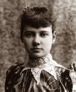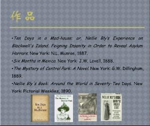 娜丽·布莱 1880年代晚期 娜丽·布莱 1880年代晚期从事采访写作前,娜丽·布莱曾发表过几篇研究报告。之后她离开《匹兹堡电讯报》,前往纽约市。在此她受聘于约瑟夫·普立兹以煽情报道著称的报纸:《纽约世界报》。上任后,第一项工作就是写篇关于布莱克韦岛上女精神病院的故事。她让自己接受精神病患的待遇,并坚定的暴露在病院的可怕环境下采访,这种以秘密采访的方式完成的报道不久便成为她的标志。1890年祝贺娜丽·布莱完成环游世界所发行的交换卡片(正面)1888年,有人建议《世界报》模仿儒勒·凡尔纳的著作《环游世界八十天》,派一位记者绕全球一周旅