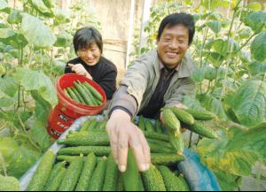 茌平县贾寨乡耿店村是当地有名的“大棚村”,家家户户搞大棚,全村有310多个冬暖式大棚,每年收获反季节黄瓜700多万公斤,仅靠黄瓜一项,全村人均增收就达7000多元。图:村民赵保东夫妻俩搞了3个冬暖大棚,每年收入六七万元。(朱玉东 吴正秋 赵玉国)