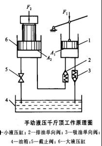 液压传动工作原理可用如图所示的液压千斤顶工作原理来说明。图中缸体6和A2组成提升液压缸;杠杆柱塞A2、缸体1和单向阀2、3组成手摇动力缸;5为截止阀(或控制阀);4为油箱。当手摇动力缸柱塞A1向上运动时,A1油腔密度容积变大,压力降低,形成局部真空,油箱4中的油液在大气压力作用下,顶开单向阀3,经吸油管道进入A1空腔。当手摇动力缸柱塞A1向下运动时,腔内油液受挤压,压力升高,迫使单向阀3关闭,单向阀2被打开向缸体6空腔输送压力油,推动柱塞A2上移,使负载的位置升高。手摇动力缸柱塞A1动作快,重物升高就快。如果杠杆停止动作,A2腔油液压力迫使单向阀2关闭,重物停在在新的位置上。如果打开控制阀5,则A2腔中油液经阀5流回油箱4,重物在重力作用下下降。阀5开度大,重物下降就快。