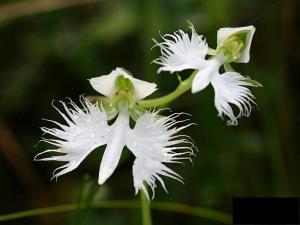 鹅毛玉凤花(2)总状花序具7―20余朵花,长5-12厘米,花序轴无毛;花苞片披针形,长2-3厘米,先端渐尖,短于子房;子房圆柱形,扭转,无毛,连花梗长2―3厘米,先端渐狭,具喙;花白色,较大,萼片和花瓣边缘具缘毛;中萼片宽卵形,直立,凹陷,长10-13毫米,宽7-8毫米,先端急尖,具5脉,与花瓣靠合呈兜状;侧萼片张开或反折,斜卵形,长14-16毫米,先端急尖,具5脉;花瓣直立,镰状披针形,不裂,长8-9毫米,宽2-2.5毫米,先端稍钝,具2脉;唇瓣宽倒卵形,长l5-18毫米,宽12-16毫米,3裂;侧裂片近菱形或近半圆形,宽7-8毫米,前部边缘具锯齿;中裂片线状披针形或舌状披针形,长5-7毫米,宽1.5-3毫米,先端钝,具3脉;距细圆筒状棒形,下垂,长达4厘米,中部稍向前弯曲,向末端逐渐膨大,末端钝,较子房长,中部以下绿色;距口周围具明显隆起的凸出物;柱头2个,隆起呈长圆形,向前伸展,并行。