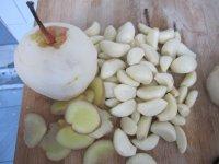 2. 苹果梨去皮切小块,蒜剥皮,姜切片