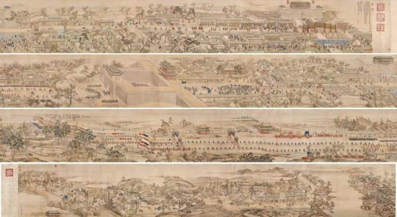 此图卷首展现的,就是乾隆出京的浩荡队伍和宏伟场景。图卷中第二、四卷均为水路运行,只见巡幸的船,约有1000多只首尾相接,旌旗招展,形成一条蜿蜒曲折的水上长龙。岸上有拉纤河兵3000多人。御前大臣,领侍卫内大臣、乾清门侍卫等乘之船只先行,作为开导。御舟周围有许多船只簇拥护卫,乾隆帝露坐船头,以便观察四周景致。岸上还有骑马官员沿河护卫着御舟,以备随时差遣。沿河两岸内,凡有支港河汉、桥头村口,都安设围站,派兵官守护。这些场景在画幅中都一一给予描绘;第六至八卷,为途经苏州、嘉兴、杭州的情景,这里正值春耕农忙季节,生动描绘了农家耕耘灌溉及采桑等活动。凡皇帝所到之处,30里以内,地方文武官员皆应着朝服前来接驾,以及妇老百姓和缙绅士子皆排列跪伏。苏杭地区经济富庶又是南方繁华都市,画卷上处处可见有丝绸、彩布搭盖的彩棚,并设有香案,河道上有龙舟灯舫,场面浩大,气势宏伟。