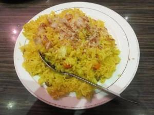 3) 黄姜糯米加胡椒粒、香茅、香兰叶蒸至半熟后,离锅拌入巳加盐之热椰奶,再蒸至黄姜饭熟透翻搅一下使之松软即可。