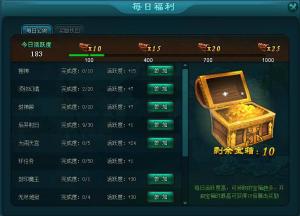 每日必做即统计玩家每天操作游戏的活跃度,游戏中的不同的活动都有其对应的活跃度和活跃度分值,当每日的分值累计到指定的额度,便可获得宝箱奖励。宝箱包含坐骑提升物品,铜钱和稀有宝石,更有几率出现10倍暴击奖励。