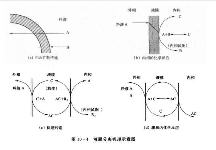 液膜分离机理主要有以下几种:①Fick扩散传递机理(无载体)②内相的化学反应③膜相的促进传递机理(含载体)④膜相的化学反应(不含载体)。