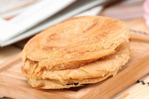 4、 上鏊:将面团压成中心稍薄,直径约7厘米的小圆饼。在鏊内倒50克油,将小圆饼逐个排放在鏊里,鏊下的火力要分布均匀。散在周围。鏊上的火力集中在鏊的中心,这样才能使酥饼的心子提起,使其涨发。约3分钟后,拿开上鏊,给酥饼淋50克清油,逐个按火色情况调换位置,防止烤焦、再将上鏊盖上,1分钟后将酥饼翻身调换位置,达到火色均匀,两面酥黄出鏊即成。
