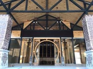 ii.图腾:借鉴了瑶族铜鼓、腰鼓上关于牛头、蚂拐和密洛陀女神的图腾文化,将图腾体现在瑶锦、柱身、壁画等内外装中;