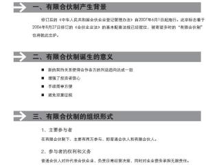 2、有限合伙制在融资的同时最大程度上保证了家族企业主的主导权虽然有限合伙人出资占一大部分却不直接参与企业经营;换个角度说就是不能干预普通合伙人的正常经营。这就保证了家族企业在融得企业发展必需资金的同时,又不失去主导权。