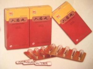 (1)取本品30丸,研碎,加三氯甲烷振摇提取3次,每次15ml,滤过,滤液浓缩至近干,加三氯甲烷0.5ml使溶解,作为供试品溶液。另取丁香酚对照品、冰片对照品,加三氯甲烷分别制成每1ml含1μl和1mg的溶液,作为对照品溶液。照薄层色谱法(附录Ⅵ B)试验,吸取上述三种溶液4μl,分别点于同一硅胶G薄层板上,以苯-丙酮(9:1)为展开剂,展开,取出,晾干,喷以5%香草醛硫酸溶液,加热至斑点显色清晰。供试品色谱中,在与丁香酚对照品色谱相应的未知上,显相同的棕色斑点;在与冰片对照品色谱相应的位置上,显相同的蓝绿色斑点。