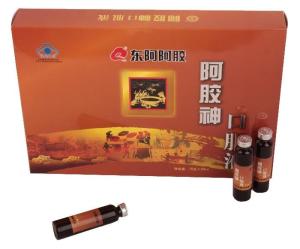 阿胶神口服液主要以“东阿”牌阿胶为主料配以乌鸡、牡蛎、枸杞子、蜂蜜等十几种天然动植物药材为原料,