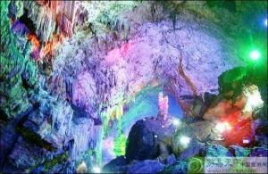 一进洞门,便是“雪溪龙宫”在霓红灯的照射下,千万钟乳石像怒放的莲花从空中倒垂下来,悬挂的莲花潭上,碧潭金波粼粼,花瓣晶莹明亮,五光十色,万紫千红,胜似瑶池仙境。莲花潭北端是一座幽清的小山峡,峡壁似削,水清如镜,峡谷幽深,耐是人寻味。峡顶一缕斜阳飞来,照在莲花潭上岸畔的数墩似玉的石笋上,一幅“金秋晚照”的丰收景象,令人神往。弯腰从石门进去,人们叫它“矮檐”。