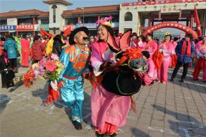 逃荒路上,老头背腰鼓,儿子舞打狗棍,老婆背翠花包,儿媳、孙女则边舞边唱,沿路行乞,12年后两家人返回胶州,这种表演形式便是胶州秧歌的雏形。胶州秧歌共有六个行当,两种表现形式,两种流派和一整套演出习俗。
